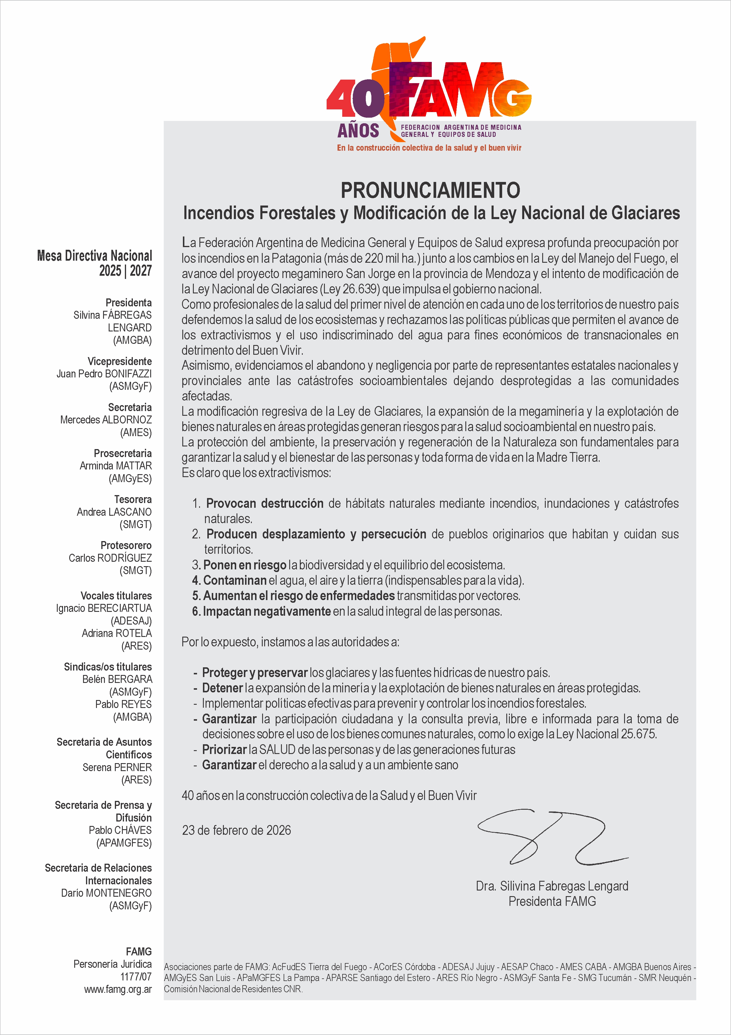 Expresamos preocupación por los incendios en la Patagonia, los cambios en la Ley del Manejo del Fuego, el avance del proyecto megaminero San Jorge en la provincia de Mendoza y el intento de modificación de la Ley Nacional de Glaciares (Ley 26.639) que impulsa el gobierno nacional.