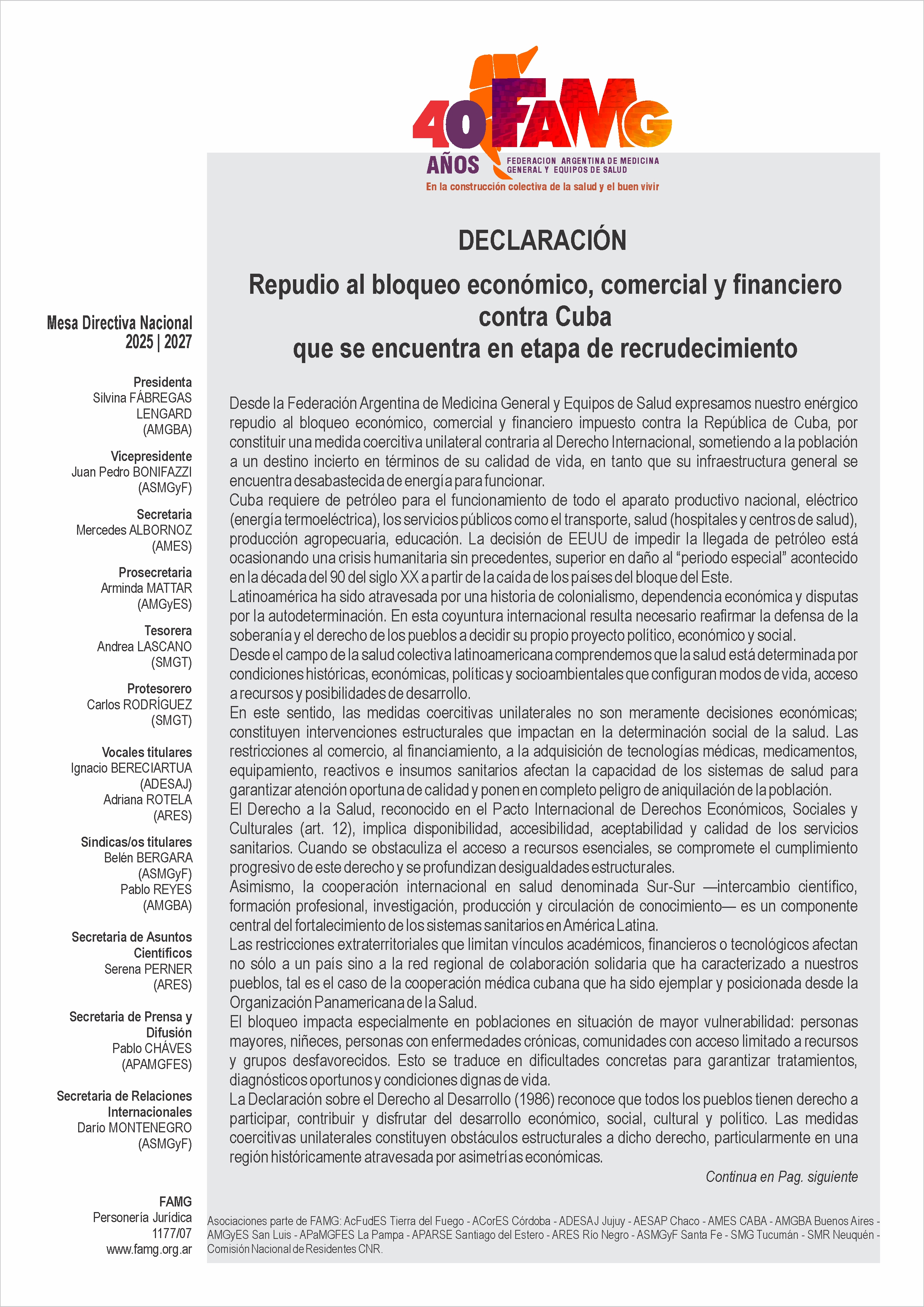 La solidaridad latinoamericana en salud no es un gesto simbólico: es una práctica histórica y ética que reconoce que la vida, el cuidado y la dignidad humana no pueden quedar subordinados a disputas geopolíticas. Expresamos nuestra máxima solidaridad con el pueblo cubano.